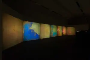 A chiudere la mostra è Liquid Crystal Environment (Ambiente a cristalli liquidi) (1966-2017) di Gustav Metzger, una grande installazione ambientale di proiezioni in continua trasformazione, colorate e psichedeliche. L’opera è una tra le più grandi ideate dall’artista con la tecnologia dei cristalli liquidi, i cui studi risalgono alle prime scoperte del botanico Friedrich Reinitzer nel 1888 e poi approfonditi dal fisico tedesco Otto Lehmann che coniò il termine “cristalli liquidi” nel 1889.