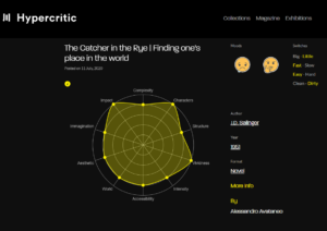 Il motivo del successo? Hypercritic si è proposto sin da subito come “motore di ricerca emotivo”, una datawarehouse che raggruppa, cataloga e seleziona prodotti culturali come libri, mostre, film, musica e spettacoli televisivi attraverso le emozioni suscitate negli utenti: una soluzione che garantisce molte più probabilità di trovare i contenuti che più ci piacciono, con un risparmio di tempo non da poco. Il trucco? Sta nel metodo, un grande grafico a radar visivamente suddivisibile in numerosi sottoparagrafi che in un colpo d’occhio restituisce le affinità tra noi e il contenuto culturale che abbiamo davanti: è l’Hypergraph, da cui nasce il nome della piattaforma.